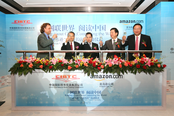 2011年9月29日,國圖集團公司和美國亞馬遜公司在北京王府井希爾頓酒店隆重舉行亞馬遜“中國書店”項目啟動儀式。國家新聞出版總署署長柳斌杰、副署長鄔書林,中國外文局局長周明偉等出席儀式。中央外宣辦三局局長張雁彬,新聞出版總署對外交流與合作司司長張福海,外文局常務副局長郭曉勇、副局長陸彩榮,新聞出版總署對外交流與合作司副司長陳英明,海關總署數據中心副總工程師陳輝等參加啟動儀式。