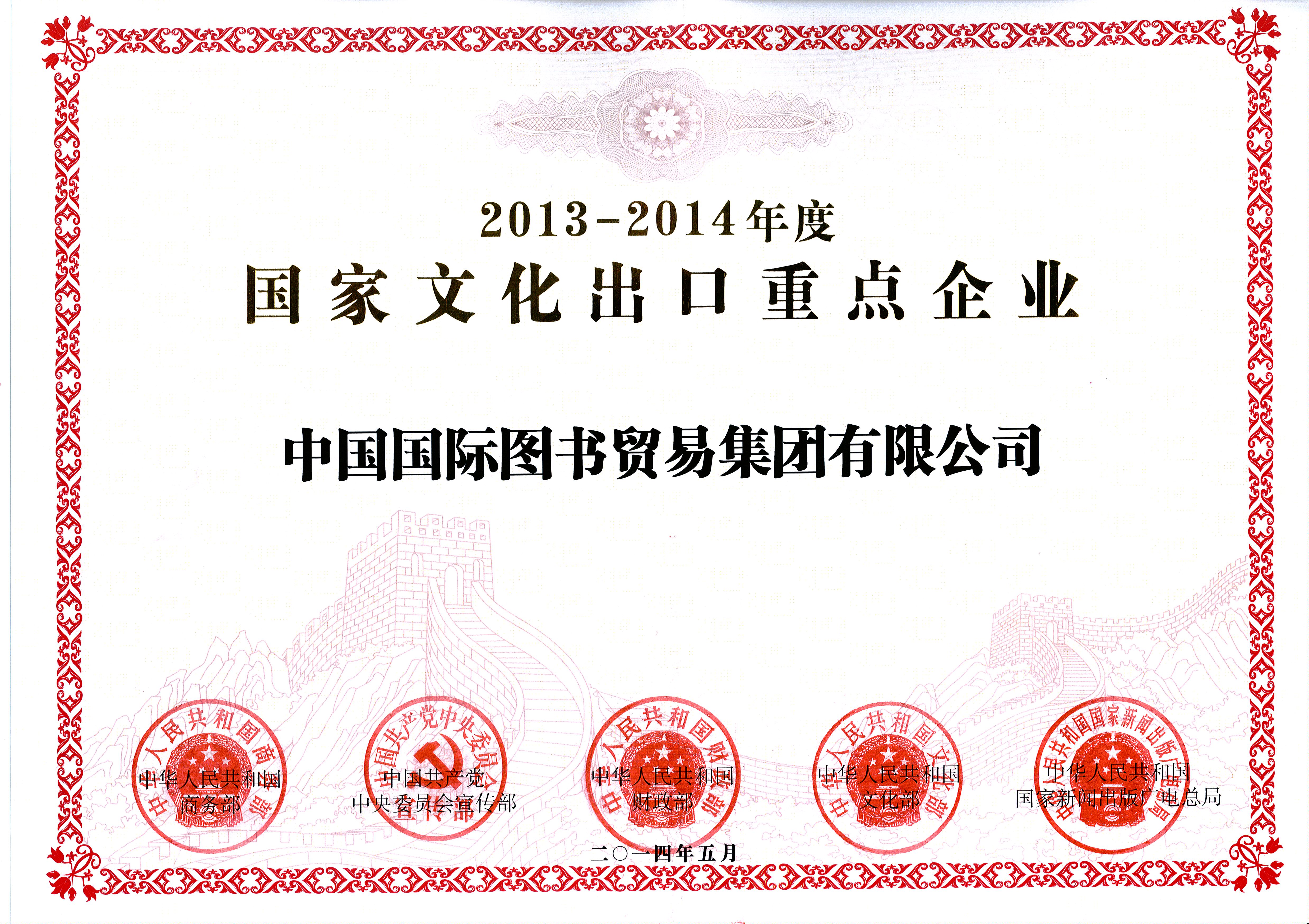 2014年5月,國圖集團公司榮獲由國家商務部、中宣部、財政部、文化部、國家新聞出版廣電總局共同頒發的“2013-2014年度國家文化出口重點企業”稱號。國圖集團公司的“國圖海外華文書店營銷網絡計劃”、“國圖歐洲出版發行基地(倫敦中心)項目”榮獲“2013-2014年度國家文化出口重點項目”稱號。