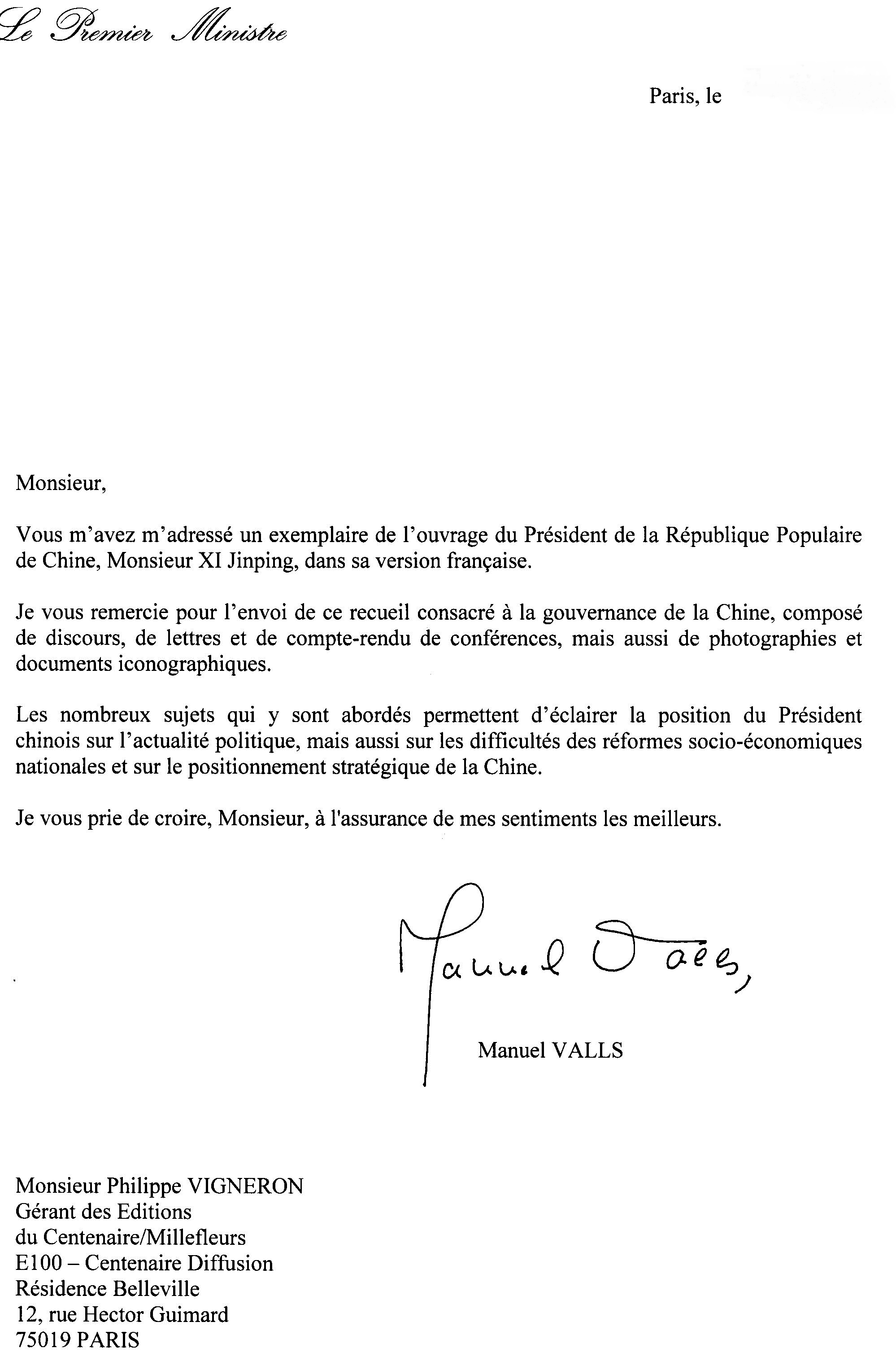 2015年5月,集團公司所屬法國百周年出版社收到了來自法國總理曼努埃爾?瓦爾斯的感謝信。信中寫到“感謝你們贈送給我由中華人民共和國主席習近平撰寫的《習近平談治國理政》一書的法文版。本書圖文并茂,囊括了關于如何治理中國的重要講話和文件。主題涉及當今中國的政治情況,國內社會經濟體制改革及戰略。請接受我最誠摯的感謝?!偫砺?瓦爾斯。”