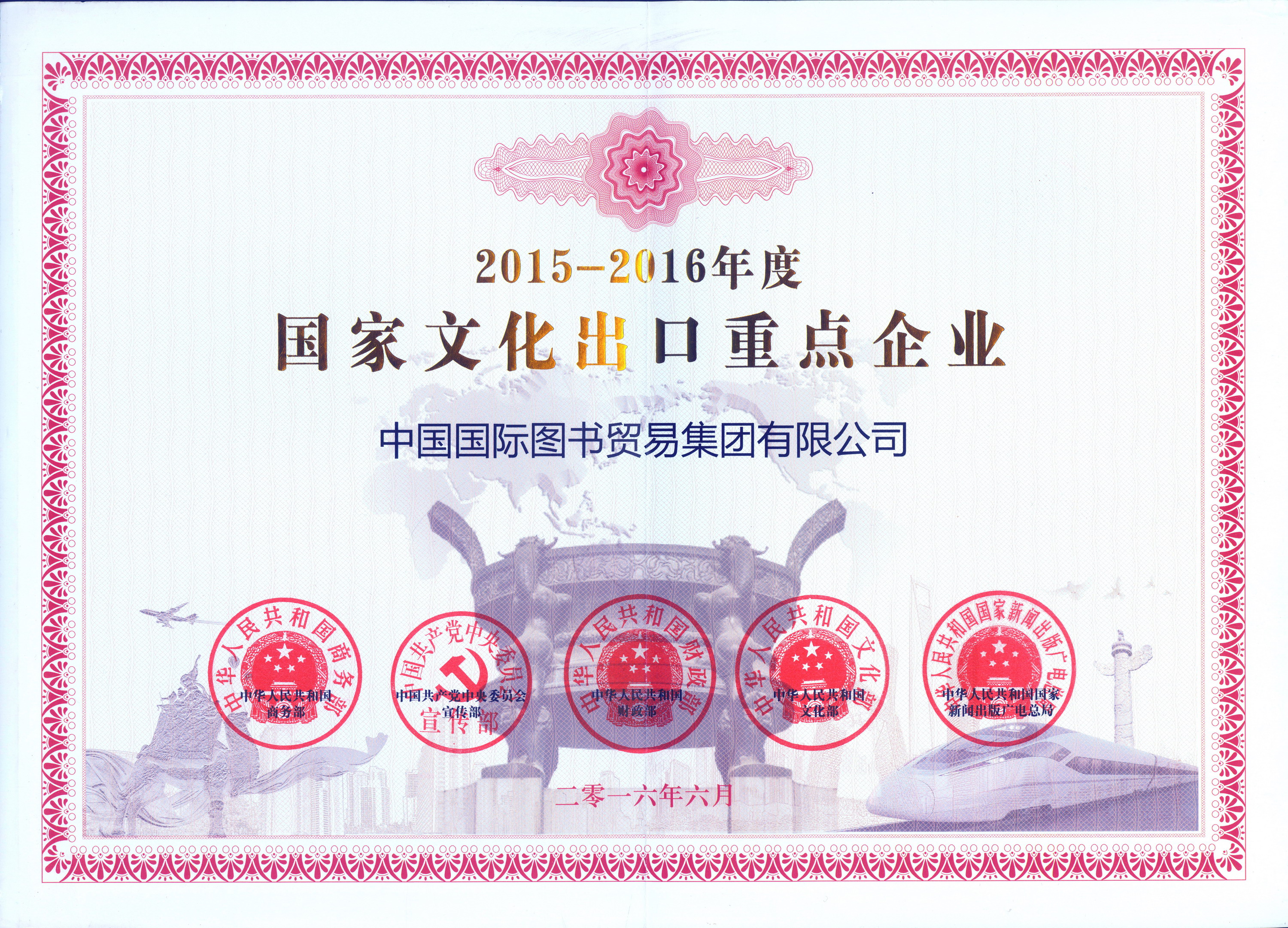 2016年6月,國圖集團公司榮獲國家商務部、中共中央宣傳部、財政部、文化部、國家新聞出版廣電總局頒發的2015-2016年度國家文化出口重點企業稱號。國圖集團公司“亞馬遜中國項目”榮獲2015-2016年度國家文化出口重點項目稱號。