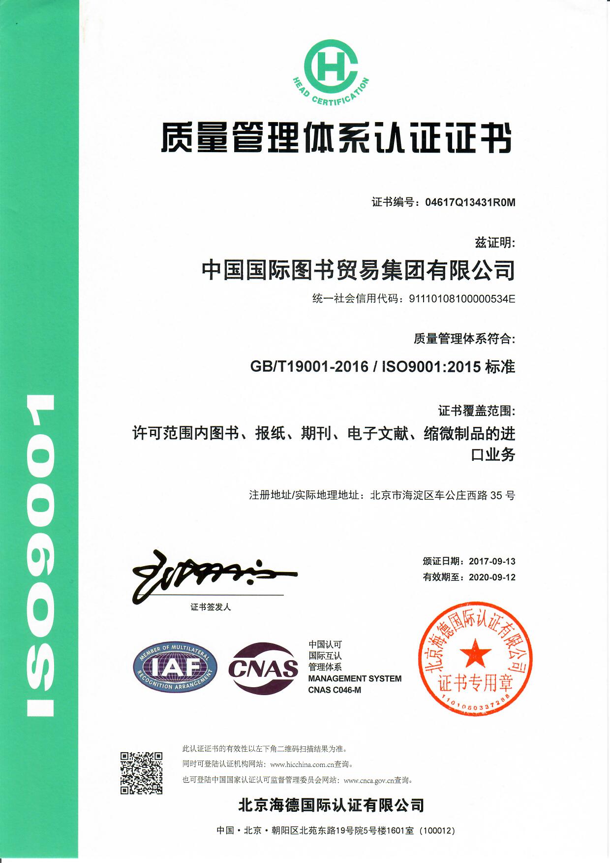 2017年9月,國圖集團公司成功獲得ISO9001國際質量標準體系認證。ISO9001質量管理體系是ISO組織(國際標準化組織)頒布的影響面最廣的一個管理體系標準,是迄今為止世界上最成熟的質量框架,不僅為質量管理體系,也為總體管理體系設立標準。國圖集團公司引入ISO9001質量管理標準,實現了傳統圖書貿易企業與國際先進管理制度、機制的對接,不僅有助于樹立現代管理理念,提升經營水平,降低生產和運營成本,擴大品牌認同和市場占有率,更為集團公司實施“走出去”戰略,參與國際交流與競爭提供了一張質量“通行證”。